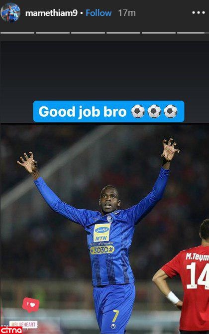 به گزارش سرویس وبگردی سیتنا، مامه تیام مهاجم سابق تیم استقلال که هواداران این تیم هنوز هم حسرت جدا شدن او از جمع آبی ها را می خورند، با انتشار یک استوری در اینستاگرام خود، به درخشش شیخ دیاباته مهاجم شماره 7 آبی ها در بازی مقابل تراکتور واکنش نشان داد و هتریک او در این بازی را به او تبریک گفت و برایش آرزوی موفقیت کرد.