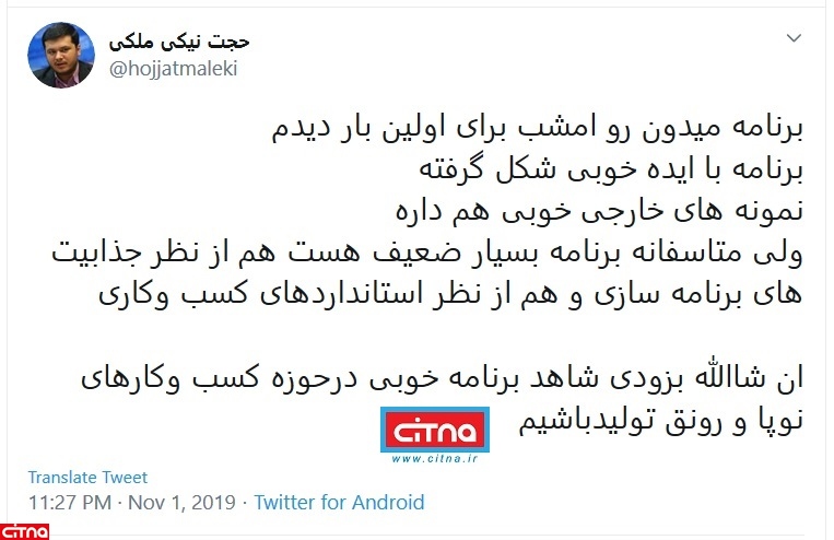 یک فعال فضای مجازی در ارزیابی رقابت تلویزیونی استعدادیابی شغلی "میدون" گفت: متاسفانه برنامه بسیار ضعیف هست، هم از نظر جذابیت های برنامه سازی و هم از نظر استانداردهای کسب وکاری،