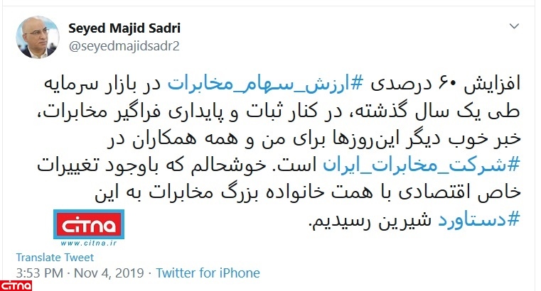 به گزارش سیتنا، مهندس سیدمجید صدری، مدیرعامل شرکت مخابرات ایران، توئیت کرد: