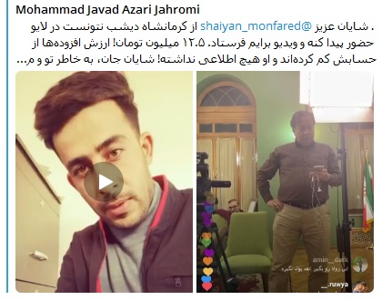 وزیر ارتباطات و فناوری اطلاعات، توضیح داد: شایان عزیز از کرمانشاه دیشب نتونست در لایو حضور پیدا کنه و ویدیو برایم فرستاد. ۱۲.۵ میلیون تومان! ارزش افزودهها از حسابش کم کردهاند و او هیچ اطلاعی نداشته!