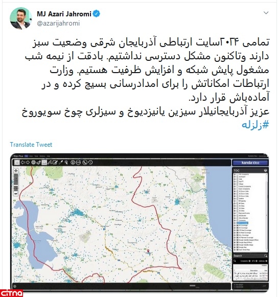 تمامی ۲۰۲۴ سایت ارتباطی آذربایجان شرقی وضعیت سبز دارند و تاکنون مشکل دسترسی نداشتیم. با دقت از نیمه شب مشغول پایش شبکه و افزایش ظرفیت هستیم. وزارت ارتباطات امکاناتش را برای امدادرسانی بسیج کرده و در آمادهباش قرار دارد.