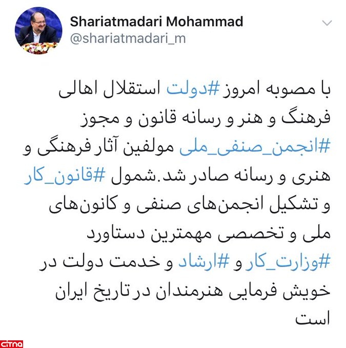 با مصوبه امروز #دولت استقلال اهالی فرهنگ و هنر و رسانه قانون و مجوز #انجمن_صنفی_ملی مولفین آثار فرهنگی و هنری و رسانه صادر شد. شمول #قانون_کار و تشکیل انجمنهای صنفی و کانونهای ملی و تخصصی مهمترین دستاورد #وزارت_کار و #ارشاد و خدمت دولت در خویش فرمایی هنرمندان در تاریخ ایران است.