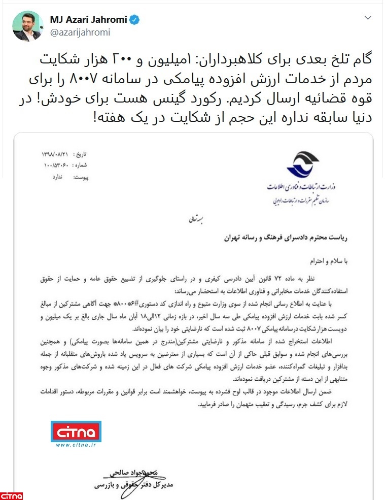 وزیر ارتباطات و فناوری اطلاعات از ارسال ۱میلیون و ۲۰۰ هزار شکایت مردم از خدمات ارزش افزوده پیامکی که در سامانه ۸۰۰۷ ثبت شده است، برای قوه قضائیه خبر داد.