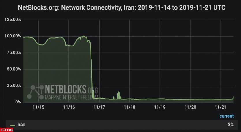 نت بلاکز تائید کرد که پس از 113 ساعت قطعی اینترنت در ایران، اتصال داخل ایران به اینترنت جهانی به آرامی در حال افزایش هست و به 8 درصد رسیده است.