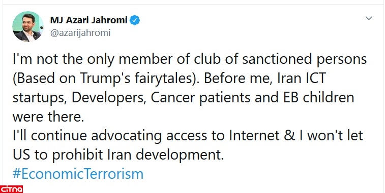 به گزارش سیتنا، آذری جهرمی در صفحه توییتر خود نوشت: من تنها عضو باشگاه تحریمی ها نیستم، قبل از من استارتآپها، توسعه دهنده ها، بیماران سرطانی و کودکان ای بی هم تحریم شده اند.