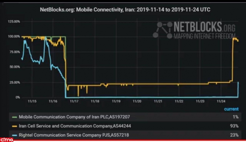 علی رغم بازگشایی اینترنت همراه در 9 استان توسط دو اپراتور همراه اول و ایرانسل، از حوالی ظهر امروز یکشنبه تا کنون، سایت نتبلاکز که وضعیت اتصال اینترنت همراه در ایران را رصد میکند، سطح دسترسی مشترکان ایرانسل را 95 درصد و همراه اول را یک درصد نشان میدهد که حاکی از اشتباه این سایت در رصد آی.پی آدرسهای متصل به اینترنت است و پیگیریهای سیتنا نشان میدهد که دسترسی مشترکان این دو اپراتور به اینترنت در استانهای اعلام شده به میزان یکسان است.