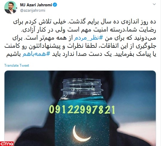 به گزارش سیتنا، آذری جهرمی توئیت کرد: