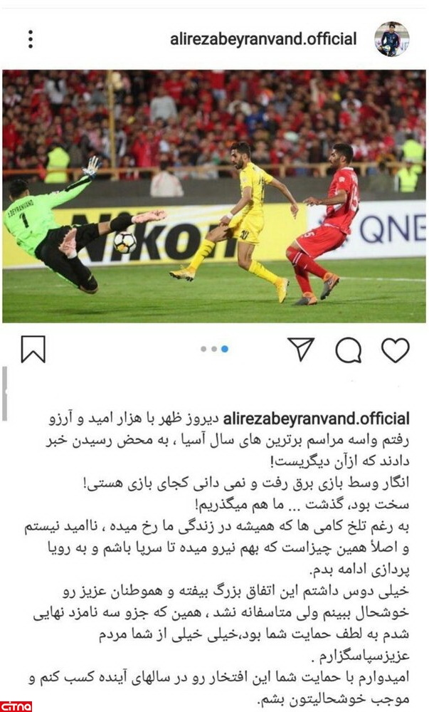 به گزارش سرویس وبگردی سیتنا، دروازه بان پرسپولیس که در مراسم بهترین های فوتبال آسیا ایران شرکت کرد، پس از آنکه بهترین بازیکن سال آسیا نشد، پستی در صفحه اینستاگرام خود منتشر کرد.