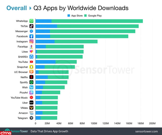 نمودار زیر به ترتیب محبوبترین اپلیکیشنهای دانلود شده را توسط کاربران در هر دو پلتفرم فروشگاههای اپ استور اپل و گوگل پلی استور نشان میدهد: