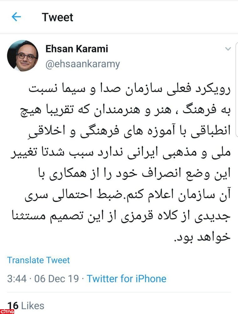 احسان کرمی اعلام کرد تا زمانی که رویکرد صدا و سیما نسبت به فرهنگ، هنر و هنرمندان تغییر نکند، با صدا و سیما همکاری نخواهد کرد.