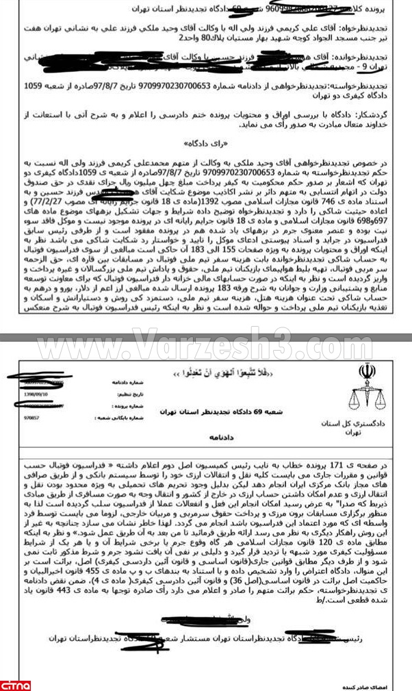 ملکی در ادامه با اشاره به پیگیری این پرونده در دادگاه تجدید نظر گفت: در ادامه با وجود آن که حکم قطعی نشده بود متاسفانه شاکی و وکیل ایشان در رسانهها شروع به انتشار مفاد حکم علیه موکلم نمودند و همان طور که حقوقدانان می دانند این عمل (انتشار حکم کیفری قبل از قطعی شدن آن) طبق قانون آیین دادرسی کیفری، در حکم افترا محسوب میشود. با این حال آقای کریمی سعه صدر نشان دادند و از شکایتی که بنده قصد مطرح کردن آن را داشتم صرف نظر نمودند. لذا صرفا به حکم صادره علیه آقای کریمی اعتراض نظرخواهی نموده که پرونده به شعبه 69 تجدید نظر تهران جهت رسیدگی مجدد محول شد. شعبه محترم با بررسی دقیق و ملاحظه اسناد و مدارک لازم از جمله نامه های آقای کفاشیان (رییس فدراسیون وقت) به کمیسیون اصل 90 که دقیقا اشاره به ساز و کار واریز پول به حساب شخص ثالث داشته، امعان نظر نموده و در نهایت برائت آقای کریمی و حکم به حقانیت موکل را صادر نمودند.