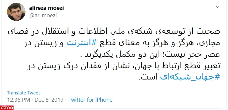 معاون ارتباطات و اطلاعرسانی دفتر رئیسجمهوری، نوشت: صحبت از توسعهی شبکهی ملی اطلاعات و استقلال در فضای مجازی، هرگز و هرگز به معنای قطع اینترنت و زیستن در عصر حجر نیست؛ این دو مکمل یکدیگرند.