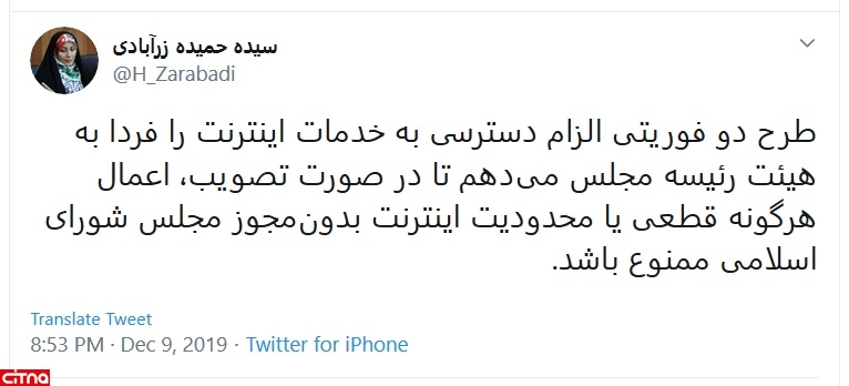 طرح دو فوریتی الزام دسترسی به خدمات اینترنت را فردا به هیئت رئیسه مجلس میدهم تا در صورت تصویب، اعمال هرگونه قطعی یا محدودیت اینترنت بدونمجوز مجلس شورای اسلامی ممنوع باشد.