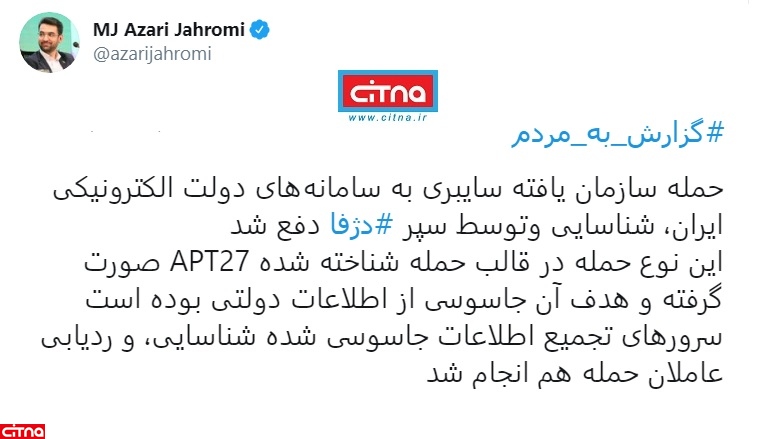 وزیر ارتباطات و فناوری اطلاعات، گفت: حمله سازمان یافته سایبری به سامانههای دولت الکترونیکی ایران، شناسایی و توسط سپر دژفا دفع شد.