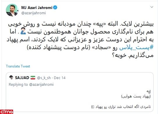بیشترین لایک. البته «پپه» چندان مودبانه نیست و روش خوبی هم برای نام‌گذاری محصول جوانان هموطنمون نیست. اما به احترام این دوست عزیز و عزیزانی که لایک کردند، اسم پهپاد ⁧#پست_پلاس⁩ رو «سجاد» (نام دوست پیشنهاد کننده) می‌گذاریم. خوبه؟