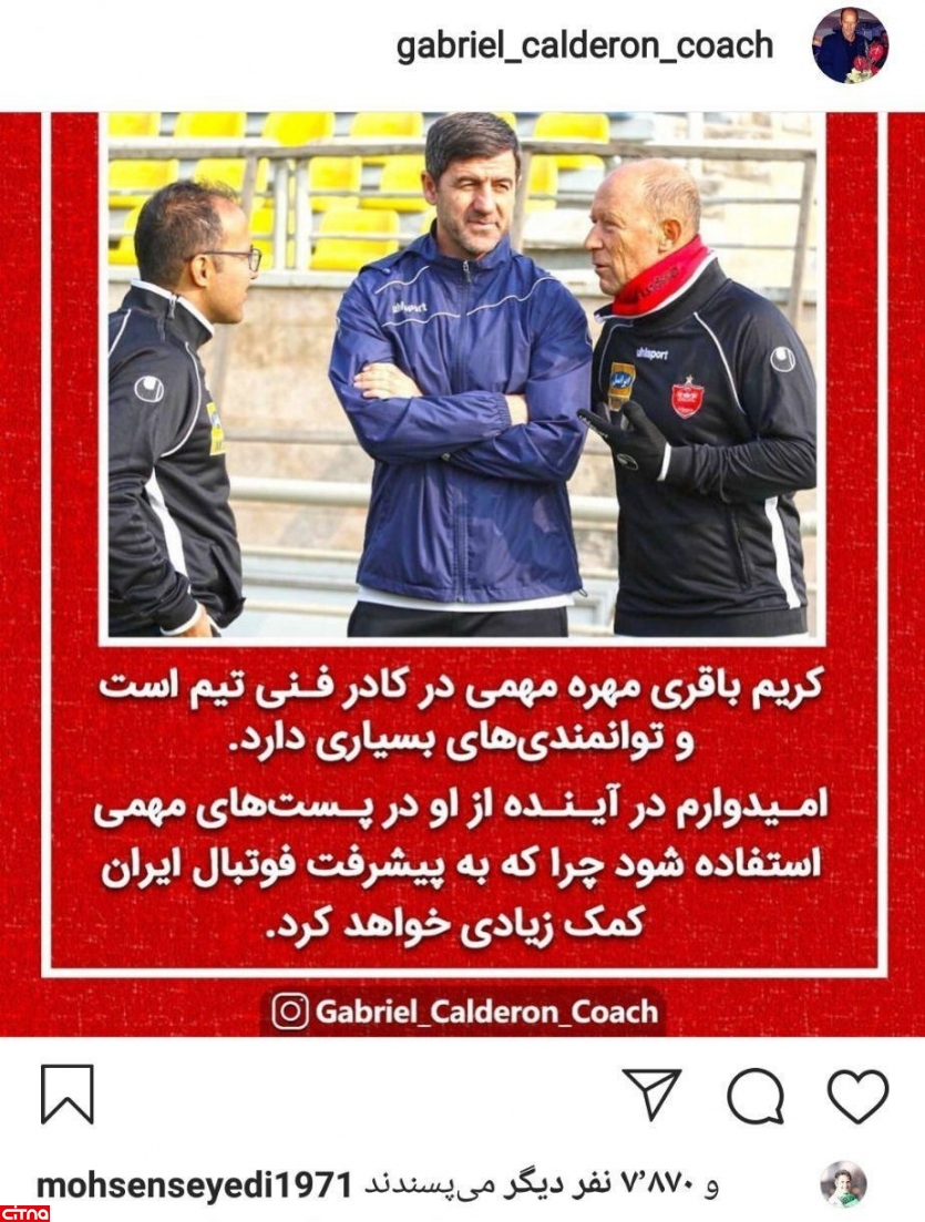 گابریل کالدرون پست جالبی برای اثبات توانایی و تأثیر کریم باقری در کادرفنی پرسپولیس منتشر کرد.