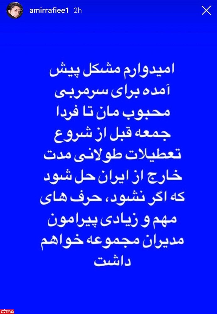 به گزارش سرویس وبگردی سیتنا، امیر رفیعی در اینستاگرام نوشت: «امیدوارم مشکل پیش آمده برای سرمربی محبوبمان تا فردا جمعه قبل از شروع تعطیلات طولانی مدت خارج از ایران حل شود، که اگر حل نشود حرفهای مهم و زیادی پیرامون مدیران مجموعه خواهم داشت.»