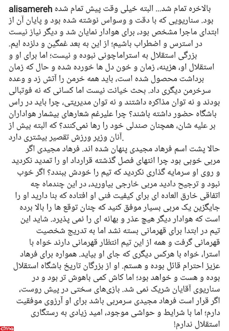 به گزارش سرویس وبگردی سیتنا، علی سامره، پیشکسوت استقلال در خصوص اتفاقات اخیر پیرامون نیمکت مربیگری استقلال در اینستاگرامش نوشت: