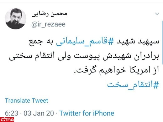 محسن رضایی بدنبال شهادت سرلشکر قاسم سلیمانی پیام توییتری منتشر کرد.