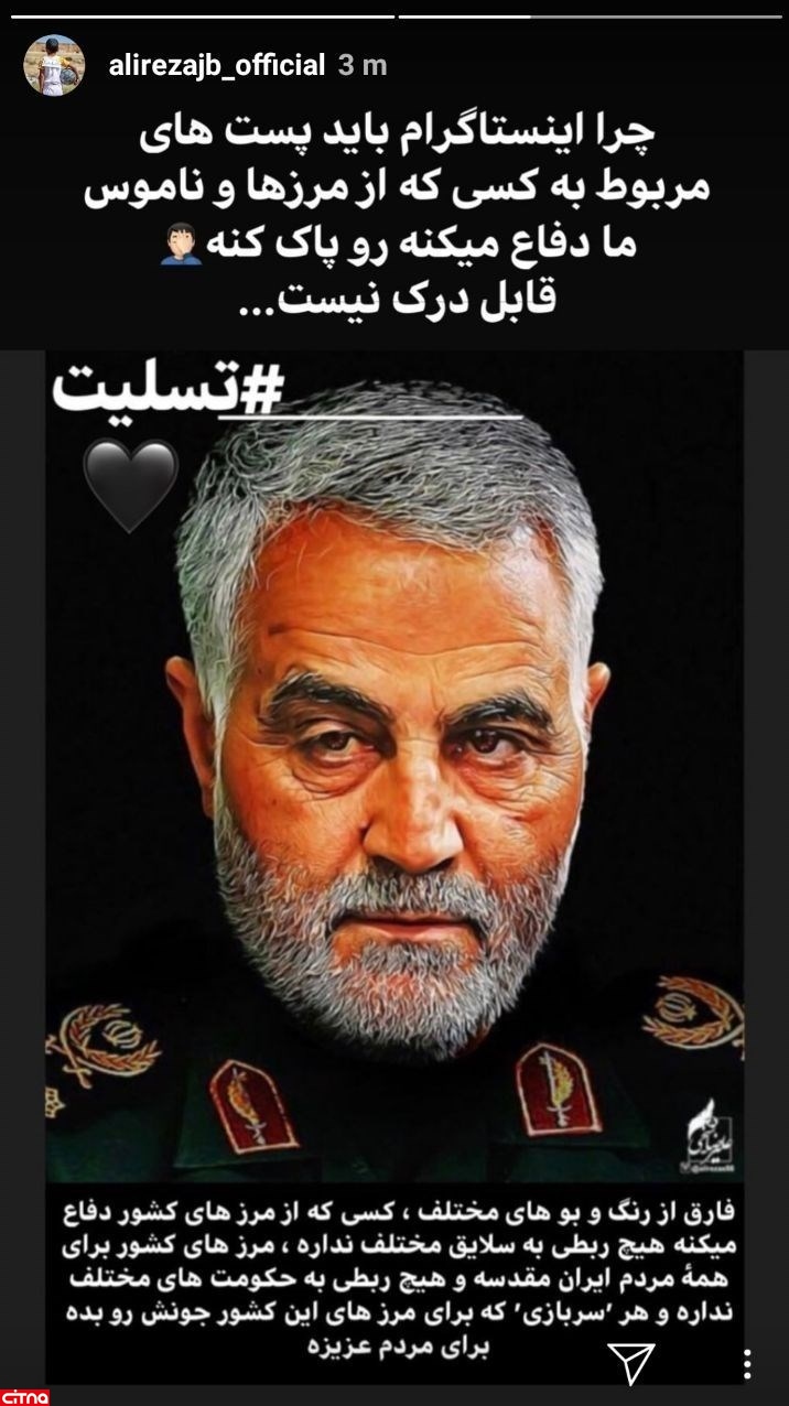علیرضا جهانبخش با انتشار تصویر سردار سپهبد، حاج قاسم سلیمانی در صفحه شخصیاش نوشت: «چرا اینستاگرام باید پستهای مربوط به کسی که از مرزها و ناموس ما دفاع میکنه رو پاک کنه. قابل درک نیست...».