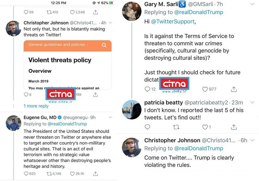 کاربران انگلیسی زبان توئیتر: ترامپ به وضوح در پی قانونشکنی در فضای مجازی است/ آیا تهدید به اقدام جنگی خلاف قوانین توئیتر نیست؟/ ترامپ بسیار وقیحانه در توییتر تهدید میکند!/ توئیتر باید طبق مرامنامهاش با ترامپ برخورد کند