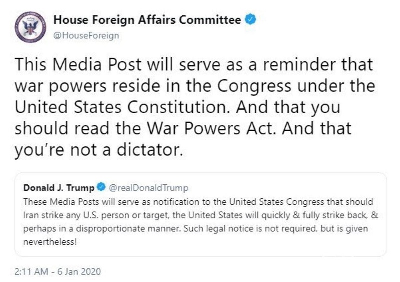 کمیته روابط خارجی مجلس نمایندگان آمریکا در جواب توئیت ترامپ، نوشت: بدین وسیله یادآوری میکنیم، که اختیار جنگ با کنگره آمریکاست و تو دیکتاتور نیستی!