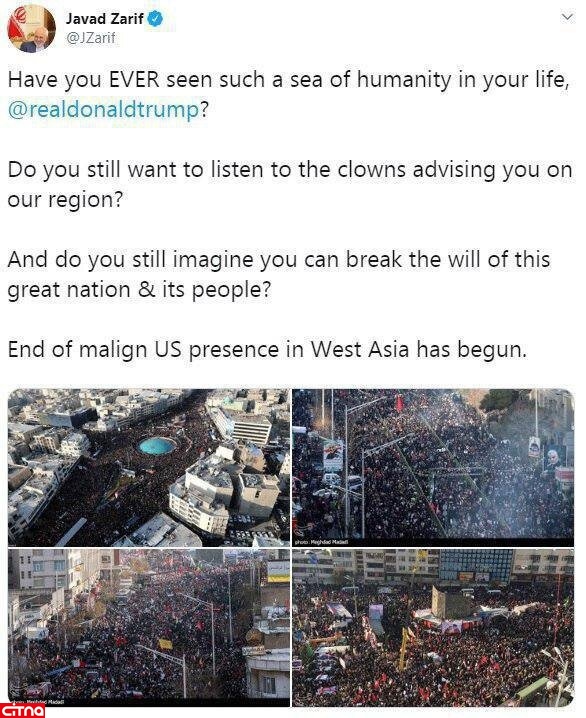 وزیر خارجه ایران با انتشار چندین عکس از حضور باشکوه مردم در مراسم تشییع پیکر سردار سپهبد قاسم سلیمانی خطاب به رئیس جمهور آمریکا نوشت: آیا در عمر خود چنین اقیانوسی از انسان یکجا دیدهاید؟