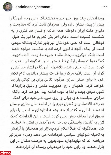 رئیس کل بانک مرکزی همچنین در پیام خود اشاره کرد: بانک مرکزی با قدرت بیشتر و با تدبیر لازم تلاش خود را برای خنثی سازی هرگونه تلاش برای بی ثباتی بازارها خواهد کرد. اطمینان دارم مدیریت عملی و دقیق بازارها تاکنون موفق بوده و لذا با قوت ادامه پیدا خواهد کرد.