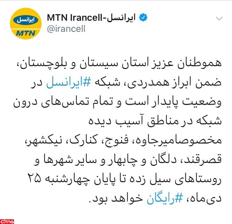 تمام تماسهای درون شبکه ایرانسل در مناطق آسیب دیده استان سیستان و بلوچستان مخصوصا میرجاوه، فنوج، کنارک، نیکشهر، قصرقند، دلگان و چابهار و سایر شهرها و روستاهای سیل زده تا پایان چهارشنبه ۲۵ دیماه، رایگان است.