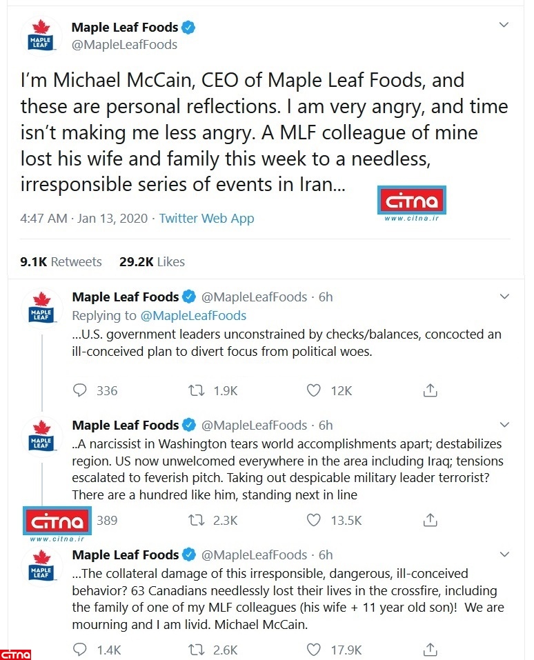 به گزارش سرویس وبگردی سیتنا، میشائیل مککین، مدیرعامل یک شرکت بزرگ کانادایی فعال در حوزهی مواد غذایی که یکی از همکارانش، همسر و پسر 11 سالهاش را در سانحهی هوایی سقوط هواپیمای اوکراینی از دست داده است، در حساب توئیتری رسمی شرکتش، ضمن معرفی خود و ابراز ناراحتی عمیق از اتفاق رخ داده در سانحهی سقوط هواپیمای اوکراینی در ایران، در رشته توئیتی نوشت: