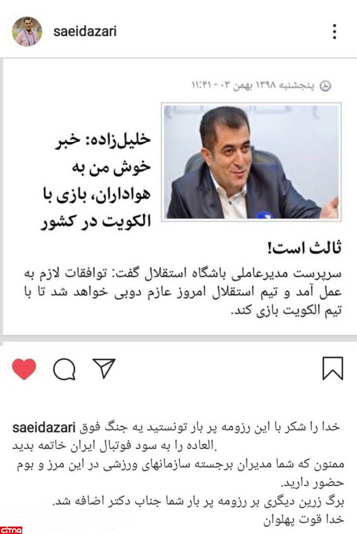 کنایه سنگین سعید آذری به مدیرعامل استقلال در اینستاگرام