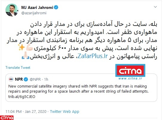 گفتنی است؛ حساب توییتر شبکهی NPR آمریکا با انتشار عکسی ماهوارهای از سایت امام خمینی (ره) مدعی شد که ایران آماده پرتاب یک ماهواره به فضا میشود.