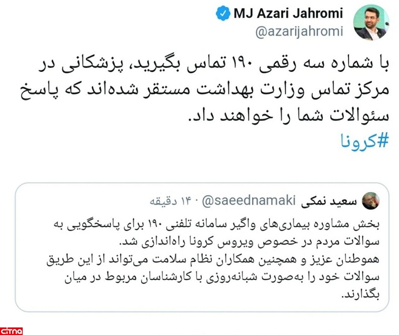 وزرای ارتباطات و بهداشت خبر دادند: بخش مشاوره بیماری های واگیر سامانه تلفنی ۱۹۰ برای پاسخگویی به سوالات مردم در خصوص ویروس کرونا راه اندازی شد.