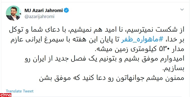 از شکست نمیترسیم، نا امید هم نمیشیم، با دعای شما و توکل بر خدا، #ماهواره_ظفر تا پایان این هفته با سیمرغ ایرانی عازم مدار ۵۳۰ کیلومتری زمین میشه. امیدوارم موفق بشیم و بتونیم یک فصل جدید از ایران رو بسازیم. ممنون میشم جوانهاتون رو دعا کنید که موفق بشن.