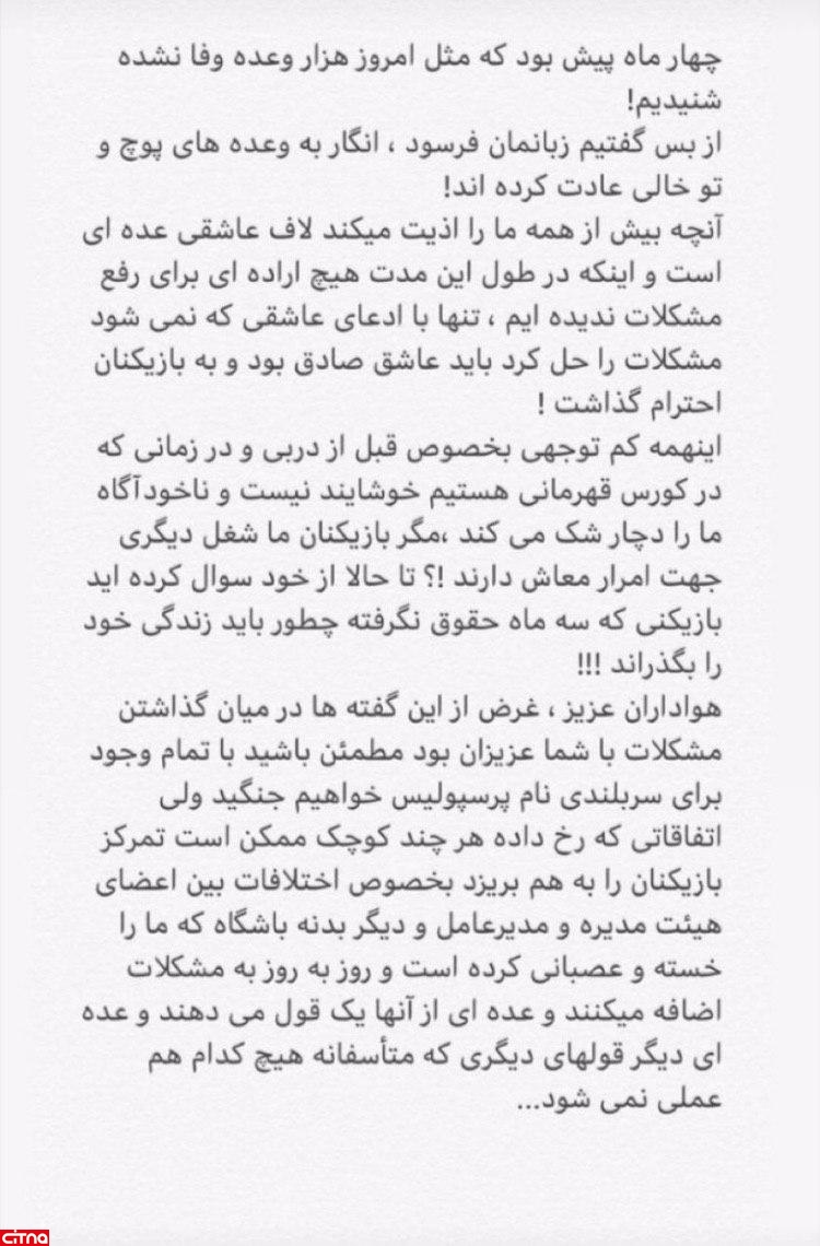 هفته گذشته بازیکنان پرسپولیس استوری مشترک جدیدی را منتشر کردند و حالا دوباره و این بار در آستانه دربی، با متنی طولانی تر، به اینستاگرام بازگشته اند! آن ها که در 4 سال اخیر، وضعیت به مراتب بهتری را از نظر مالی تجربه میکردند، حالا پس از برآورده نشدن انتظارات خود و بدقولی متوالی مدیران باشگاه، دوباره تصمیم به اعتراض گرفتهاند.
