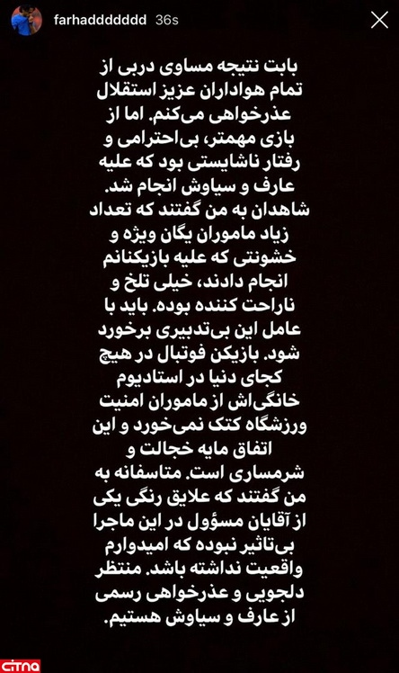 بابت نتیجه مساوی دربی از تمام هواداران عزیز استقلال عذرخواهی میکنم. اما از بازی مهمتر، بیاحترامی و رفتار ناشایستی بود که علیه عارف و سیاوش انجام شد. شاهدان به من گفتند که تعداد زیاد ماموران یگان ویژه و خشونتی که علیه بازیکنانم انجام دادند، خیلی تلخ و ناراحت کننده بوده. باید با عامل این بی تدبیری برخورد شود.