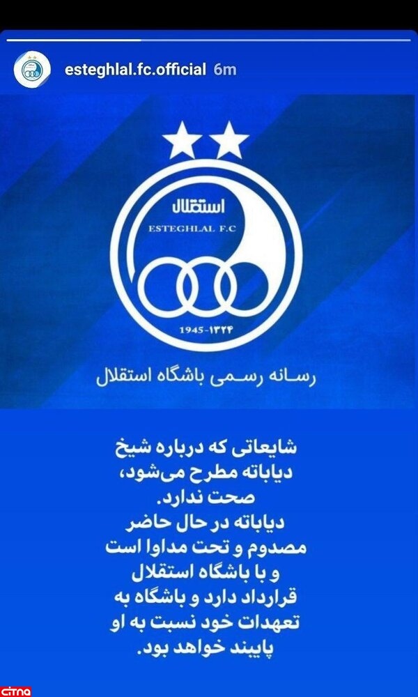 به گزارش سرویس وبگردی سیتنا، باشگاه استقلال تهران با انتشار استوری زیر در صفحه رسمی خودش در اینستاگرام نسبت به شایعه جدایی دیاباته از جمع آبی ها واکنش نشان داد.
