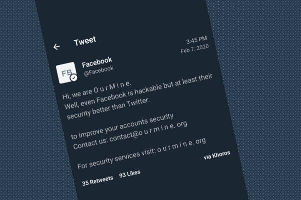 بررسیها نشان میدهد بعد از اقدام به هک از اپلیکیشنی موسوم به Khoros برای انتشار اطلاعات در حسابهای هک شده استفاده شده است. هکرها در مطلبی در حساب توئیتری فیس بوک نوشته بودند: سلام، ما OurMine هستیم. حتی فیس بوک هم قابل هک است، اما امنیت آن از توئیتر بهتر است. در ادامه آدرس ایمیل و سایت این گروه هکری در حساب مذکور درج شده بود. اعضای این گروه هکری هنوز شناسایی نشده اند.