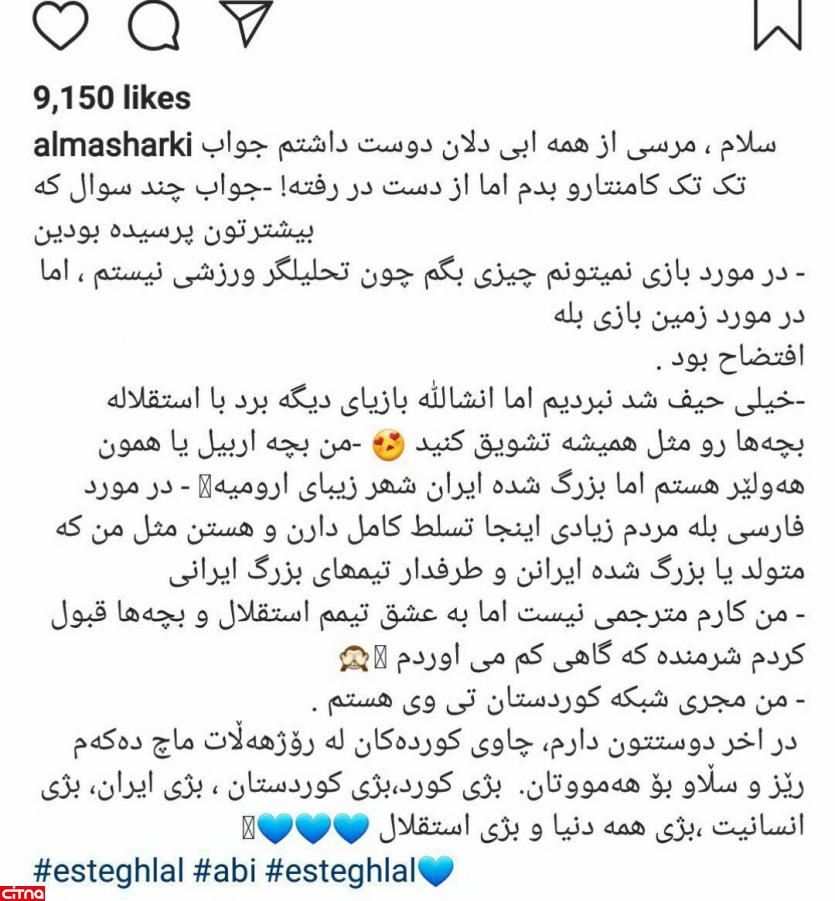 الماس حرکی مجری شبکه کردستان عراق پس از جدال استقلال و الشرطه خطاب به هواداران آبی پستی در اینستاگرام منتشر کرد.