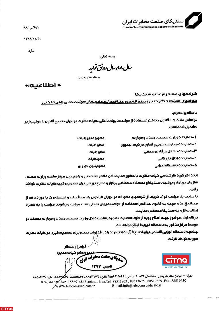 در اطلاعیهی سندیکای صنعت مخابرات ایران به امضای "فرامرز رستگار" دبیر و عضو هیات مدیرهی این سندیکا خطاب به شرکتهای عضو سندیکا، پیرامون "تشکیل هیات نظارت بر اجرای قانون حداکثر استفاده از توانمندیهای داخلی" اطلاع رسانی شد.