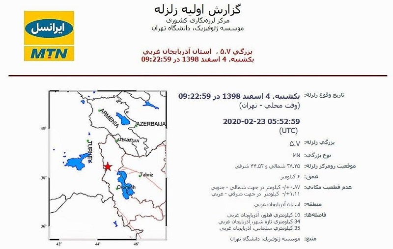 زلزلهای به بزرگی 5.7 ریشتر حوالی قطور در استان آذربایجان غربی را در عمق 6 کیلومتری زمین لرزانده است. براساس گزارشهای اولیه، این زلزله در شهرهای تبریز، اسکو، سهند، ارومیه و چند شهر و استان همجوار احساس شده است.