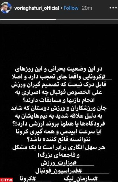 به گزارش سرویس وبگردی سیتنا، وریا غفوری کاپیتان استقلال در استوری اینستاگرامش نسبت به تعطیل نشدن بازیها واکنش نشان داد و در بخشی نوشت: