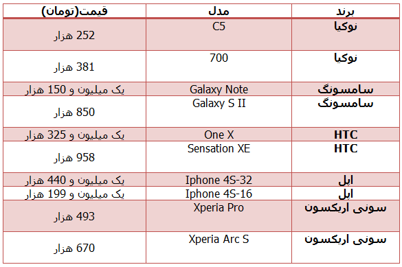 در جدول ذیل به چند نمونه از این گوشیها و قیمت آنها در بازار تهران اشاره میشود.
