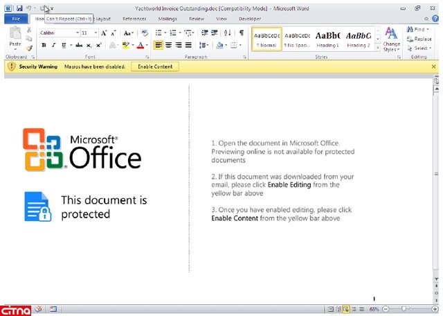 در صورتی که در فایل Word از کدهای VBA استفاده شده باشد پیغامی به شکل زیر برای کاربران نمایش داده میشود که از کاربر درخواست فعال کردن محتوای کدهای ماکرو را دارد. این کدها ممکن است که توسط هکر نوشته شده و حاوی یک کد مخرب باشد. پس در صورت اجرای فایلهای مجموعه Microsoft Office به هیچ عنوان ماکروها را فعال نکنید.