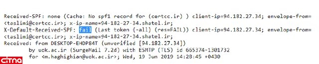ارسال یک ایمیل آلوده یا جعلی بسیار ساده و بدون دردسر است و یک مهاجم بهسادگی میتواند اقدام به ارسال یک ایمیل آلوده کند. درنتیجه اگر با یک ایمیل تحریکآمیز مواجه شدید موارد امنیتی را مد نظر داشته باشید. از جمله اینکه ایمیلهای جعلی از روی هدر مشخص هستند. کافی است به مقدار مقابل عبارت SPF توجه کنید. درصورتیکه ایمیل جعلی نباشد مقدار آن کلمه Pass است و درصورتیکه مقدار آن کلمه غیر از pass باید، مانند کلمه Fail، به معنای جعلی بودن ایمیل است.