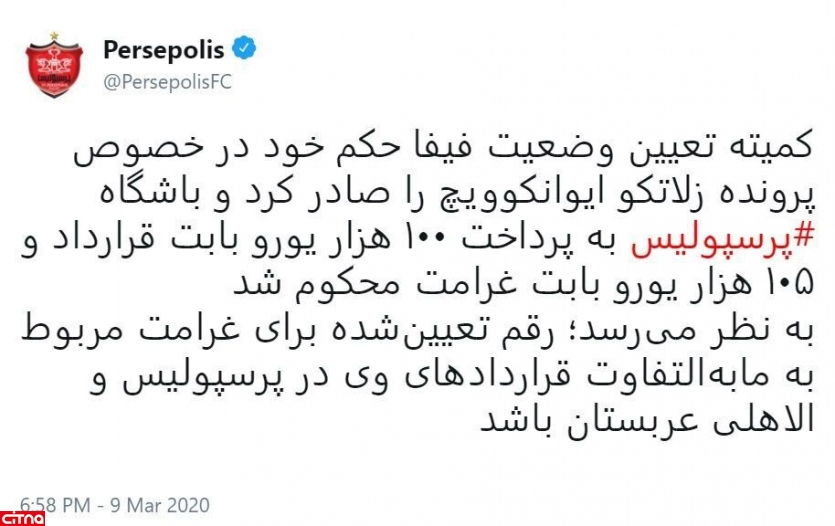 باشگاه پرسپولیس که چند روز پیش در پرونده شکایت برانکو ایوانکوویچ از این باشگاه محکوم شده بود، حالا در پرونده زلاتکو ایوانکوویچ هم محکوم شده و باید مطالبات دستیار سرمربی کروات خود را نیز پرداخت کند که با غرامتش مبلغ ۲۰۵ هزار یورو میشود.