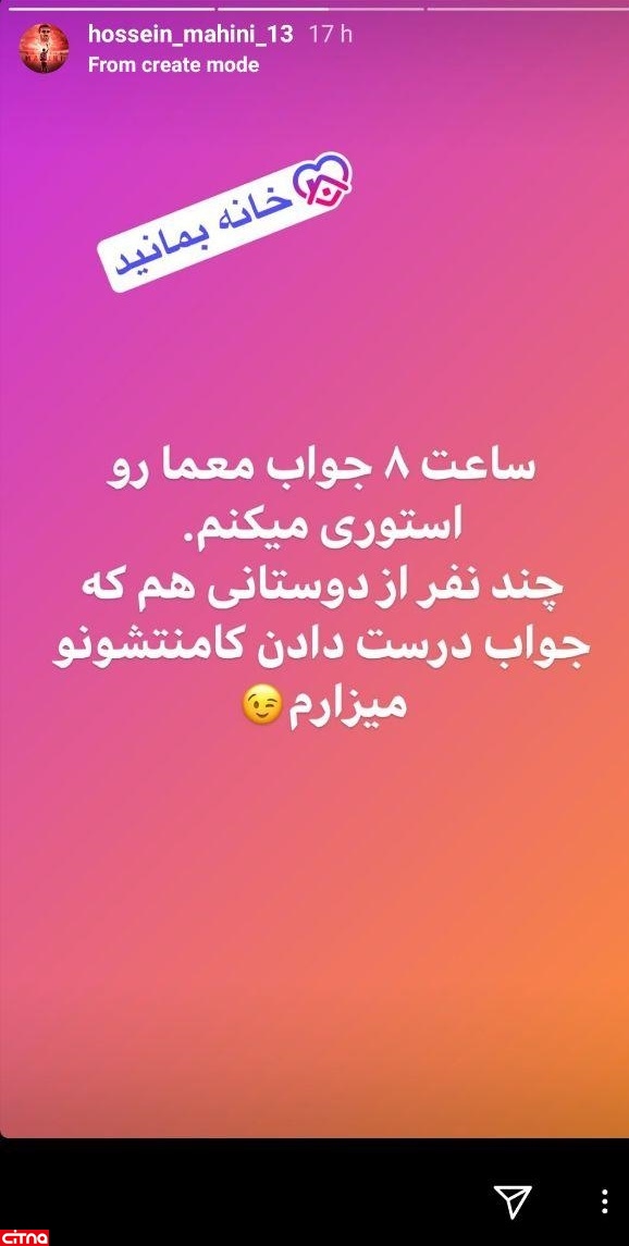 به گزارش سرویس وبگردی سیتنا، حسین ماهینی کاپیتان سابق تیم فوتبال پرسپولیس که در نیم فصل دوم به تیم نساجی پیوسته است، با انتشار یک معما در اینستاگرام خود، تا ساعت هشت شب به مخاطبانش فرصت داد تا آن را حل کنند.