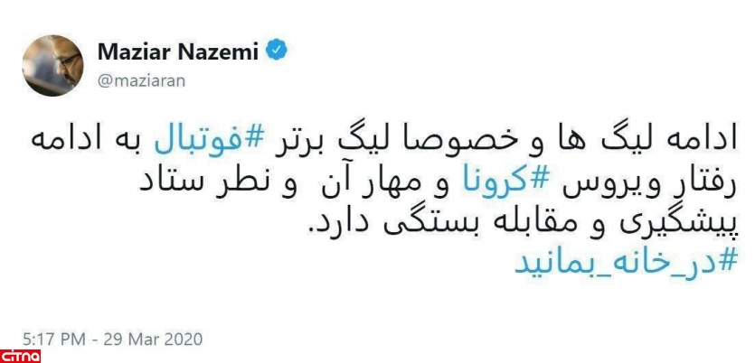 توییت مهم مازیار ناظمی در خصوص ادامه لیگ نوزدهم