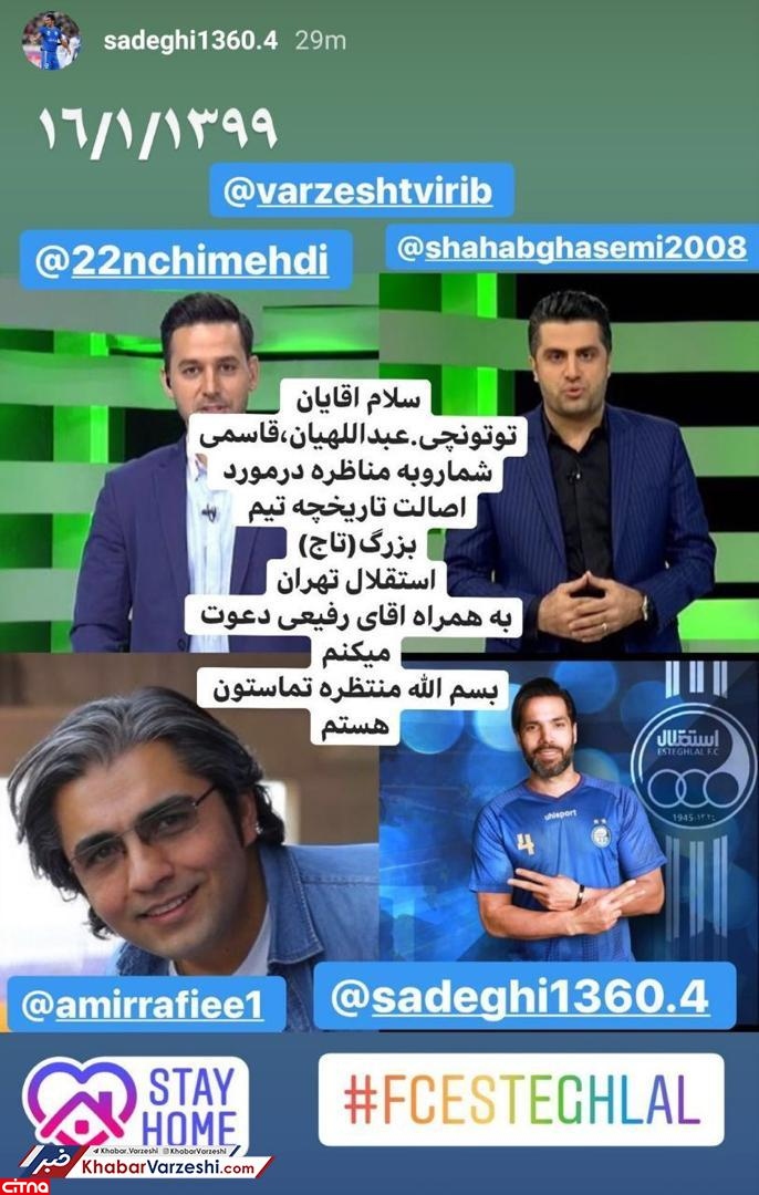 به گزارش سرویس وبگردی سیتنا، پخش یک گزارش خبرساز در شبکه ورزش باعث اعتراض شدید پیشکسوتان و هواداران استقلال شد و تبعات آن همچنان به قوت خود باقی است. در این میان، امیرحسین صادقی ملیپوش اسبق استقلال روز گذشته در فضای مجازی ضمن انتقاد شدید از مجریان برنامه نوروز فوتبالی، آنها را به مناظره دعوت کرد! البته صادقی به اشتباه نام شهاب قاسمی را هم به عنوان یکی از این مجریها در استوری خودش تگ کرد و همین مسئله دردسرهای فراوانی را برای این مجری به وجود آورده است.