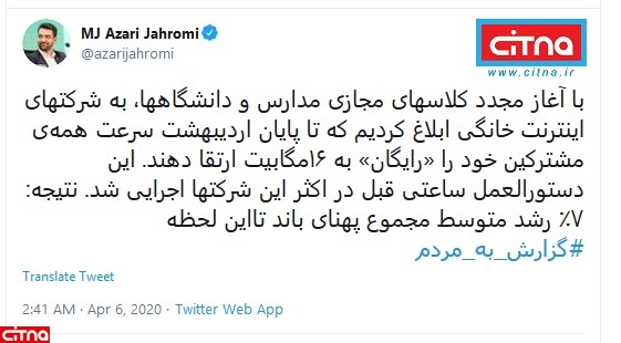 وزیر ارتباطات و فناوری اطلاعات، خبر داد: با آغاز مجدد کلاسهای مجازی مدارس و دانشگاهها، به شرکتهای اینترنت خانگی ابلاغ کردیم که تا پایان اردیبهشت سرعت همهی مشترکین خود را «رایگان» به ۱۶مگابیت ارتقا دهند.